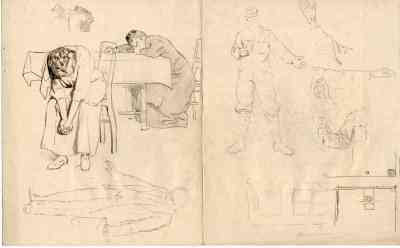 Frauen und Soldaten. _. Bleistift auf Papier. 250 x 402 mm., Frauen und Soldaten. Ohne EK-Stempel. - Zwei Frauen an einem Tisch, die eine sitzt mit gefalteten Händen und gesenktem Kopf davor, die andere mit über den Tisch gestrecktem rechtem Arm, den Kopf in die linke Hand auf den Tisch gelegt, an der Schmalseite; darunter um 90 Grad gedreht: Skizze eines stehenden jungen Mannes; in der rechten Blatthälfte Skizze eines Soldaten mit Käppi und ausgestrecktem Arm, daneben vier Handstudien. Rückseite bedruckt mit Malbuchszenen wie Nr. 199, daneben weitere Studie des Soldaten von der Vorderseite und drei flüchtige kleine Szenen jeweils in einem Rahmen.